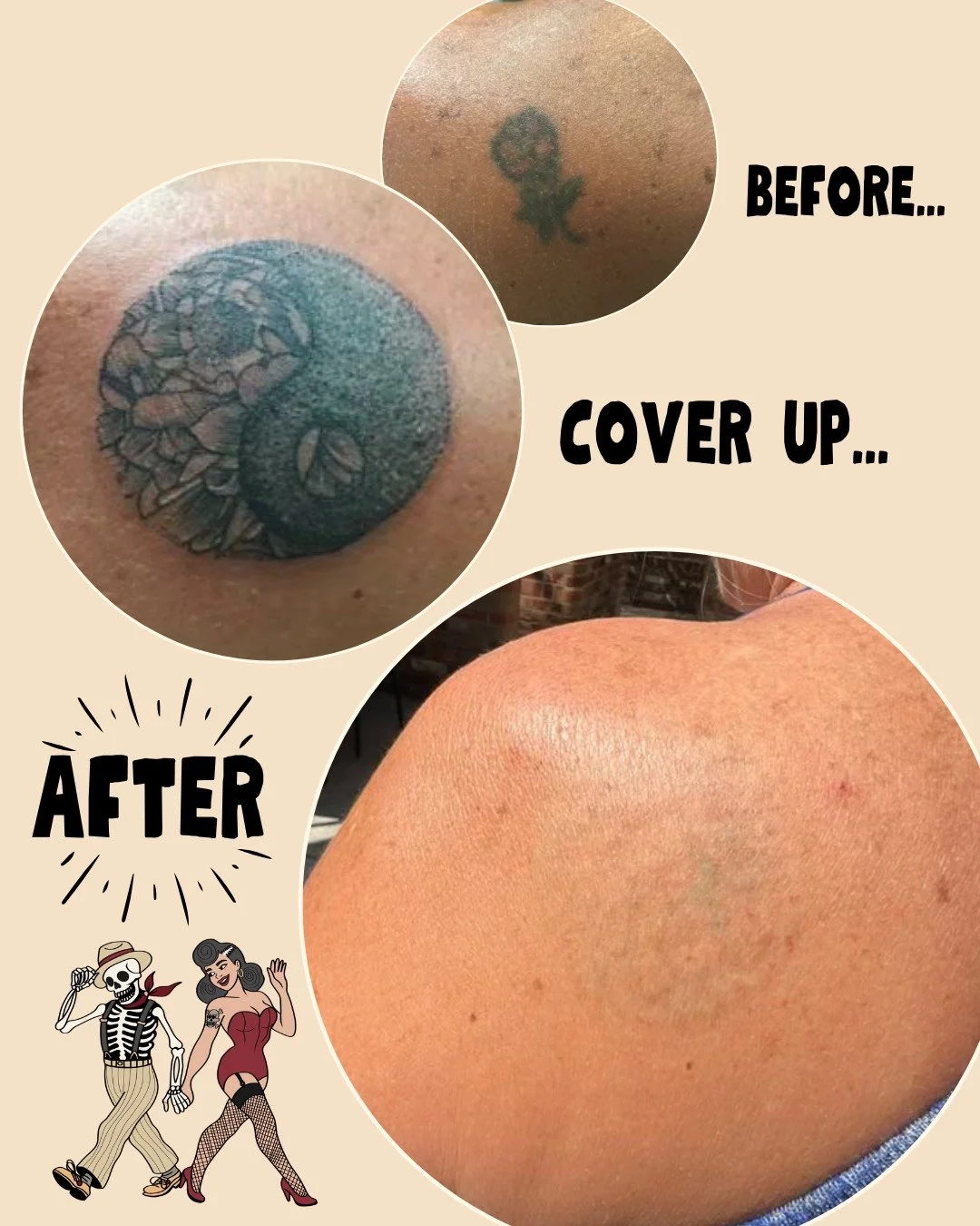 Before: Kathy’s original tattoo. Cover Up: The design used to hide it. After: We were able to clear a lot of stubborn leftover ink and reveal her natural skin.